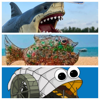 Just who is Sharky? According to his Facebook Fan Page - - created in July of 2022 - - “Sharkey cares about our world and works to pick up trash everywhere so it doesn't reach the ocean!” The page documents his travels around Maryland with an unseen human companion named Jon, gathering and safely disposing of trash, junk, recyclables, and other unwanted and uncategorizable stuff.